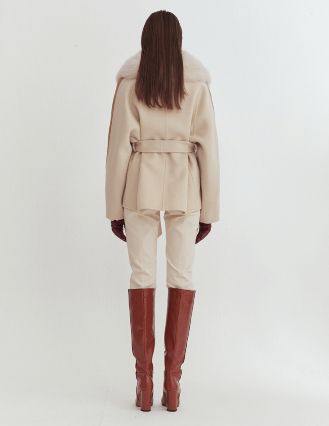 풍성한 퍼 카라와 카멜&아이보리 배색,