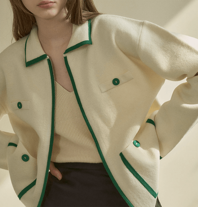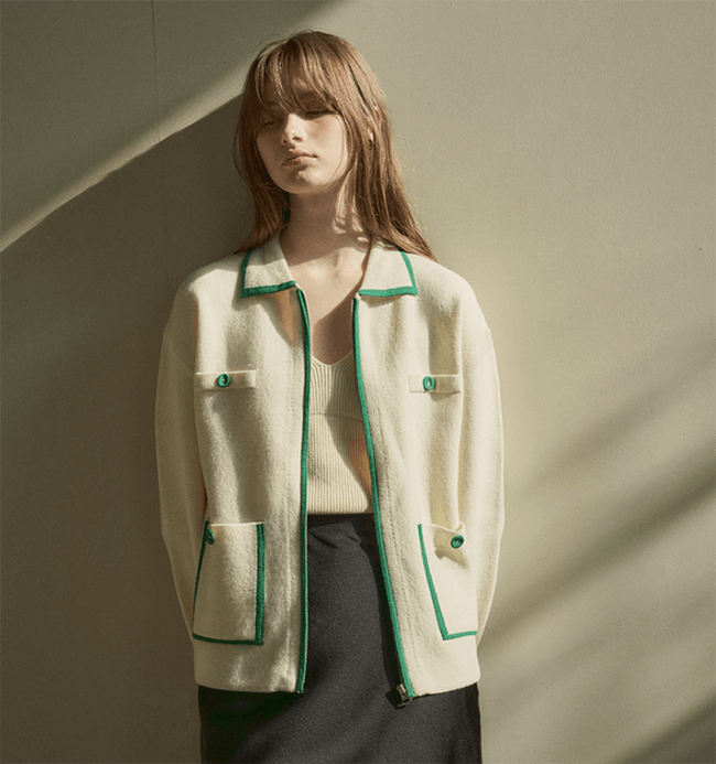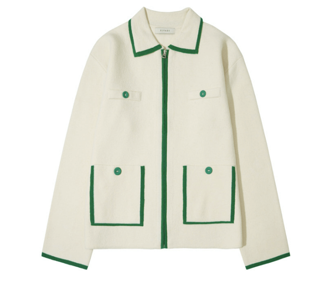 시야쥬 그린 배색 라인 집업 카라 가디건