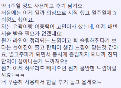 흡입형 EMS로 사용 후에 사라지는 일시적인 열감이 아니라 오랫동안 남아있는 독보적인 열 지속력과 사용하고 난 뒤 피부의 탄탄한 효과를 경험할 수 있어요. 실제 인체적용시험을 통해서 1주 사용 후 턱부위 1.26cc 감소도 확인되었다고 해요.