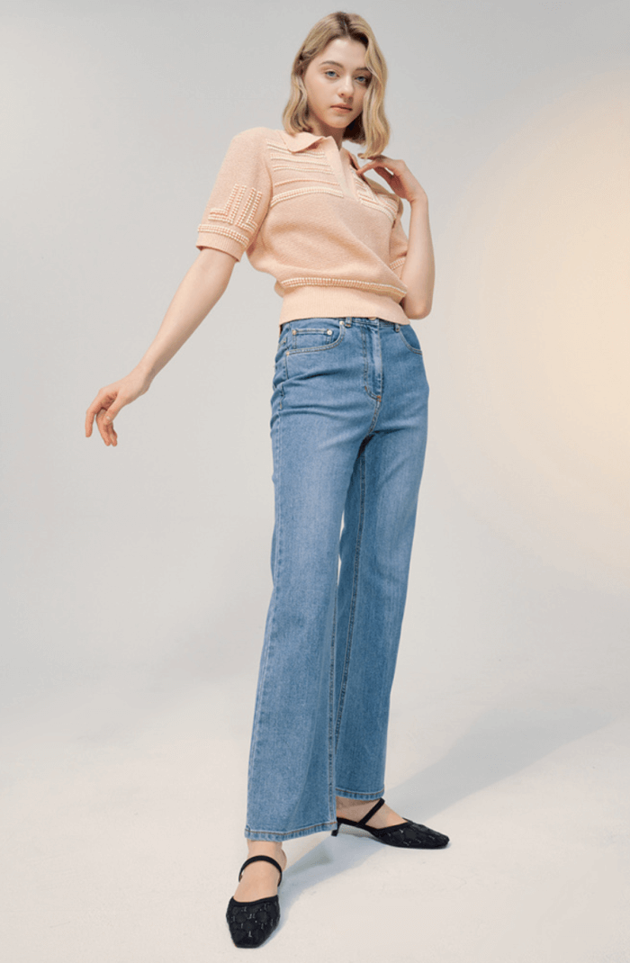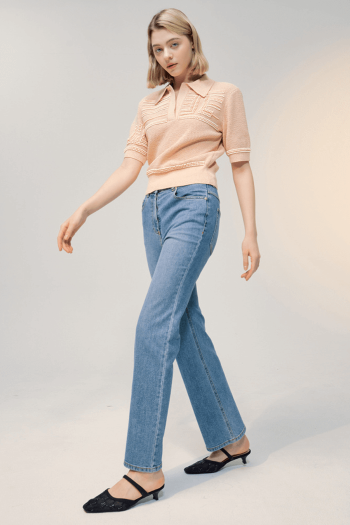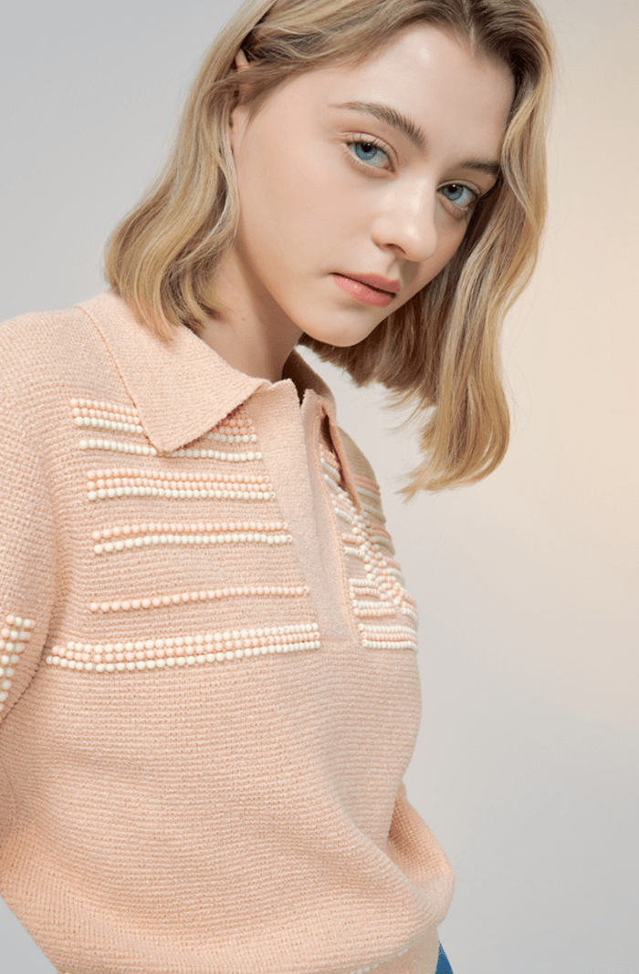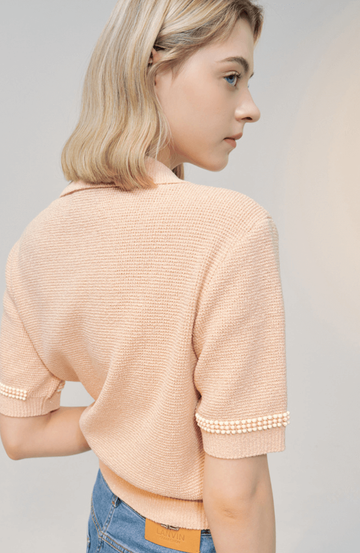포인트를 준 코랄 컬러 반팔 니트 탑