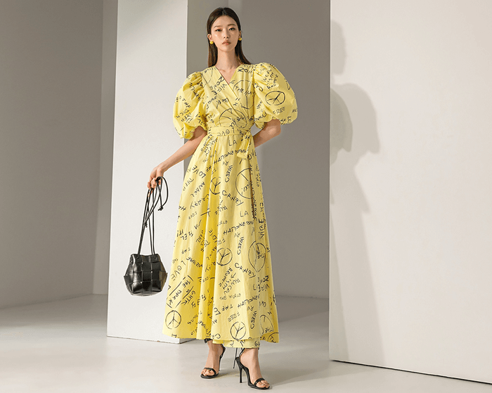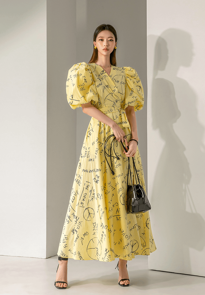 딘트 프린팅 퍼프 랩 플레어 원피스 (장윤정 옷)