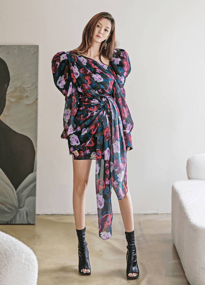 론 플라워 프린팅 퍼프 드레이프 미니 원피스