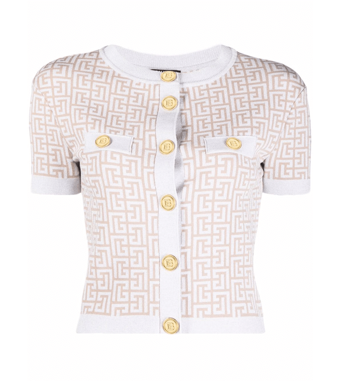Glitter monogram-knit buttoned short cardigan