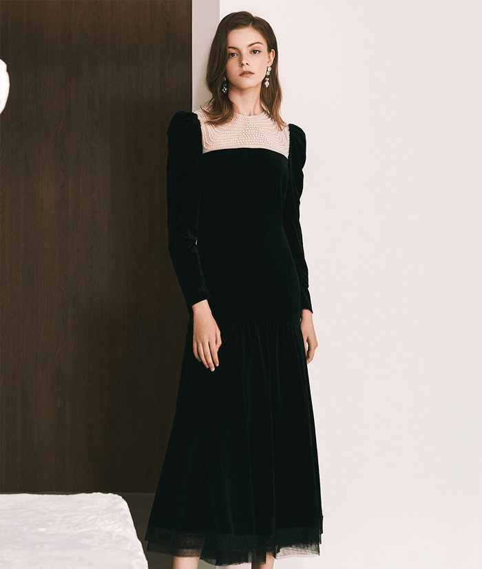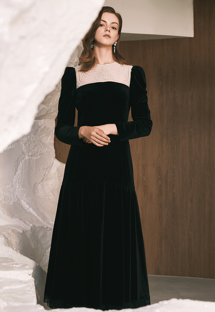 Gracelyn / Pearl Square Neck Velvet Long Dress (Black)