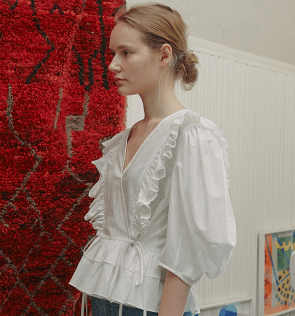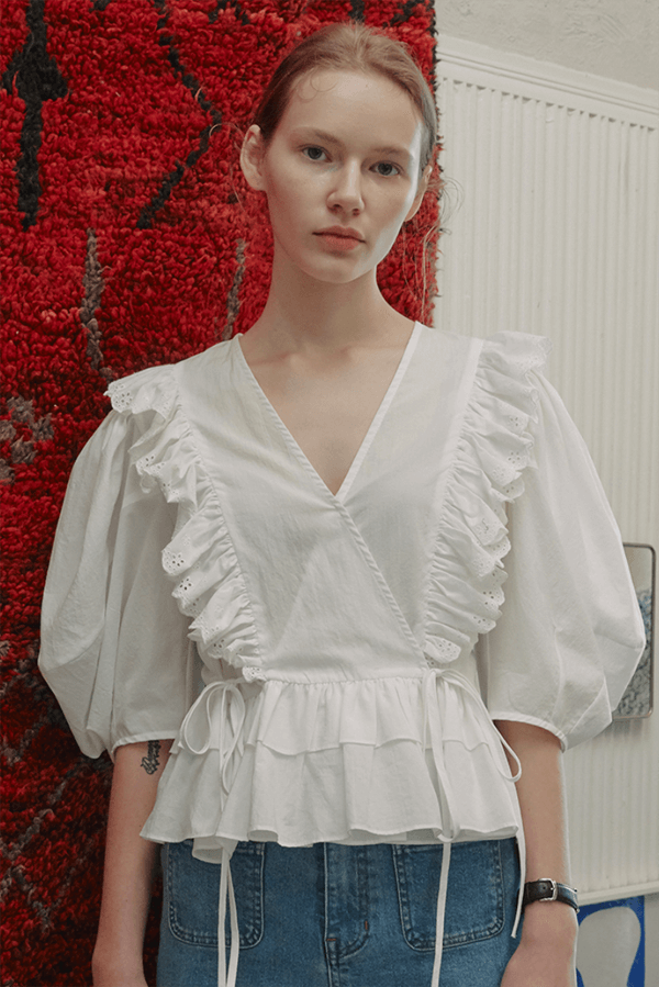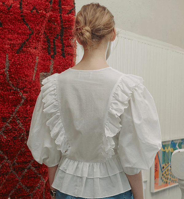 화이트 반팔 러플 블라우스